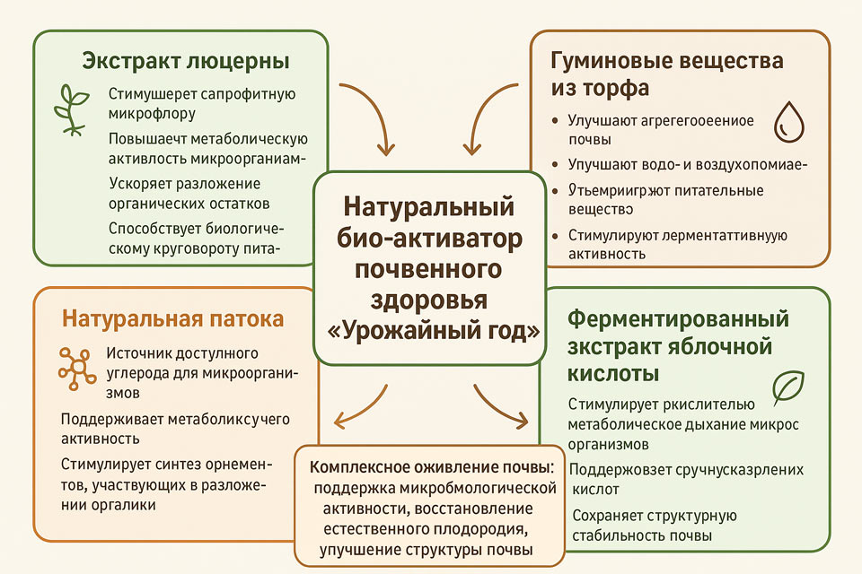 Средство Натуральный био-активатор почвенного здоровья «Урожайный год» представляет собой синергетический комплекс, включающий биодоступный экстракт люцерны, гуминовые вещества из торфа, натуральную патоку, ферментированный экстракт яблочной кислоты и технологически очищенную воду. Каждый компонент обеспечивает уникальное биохимическое и микробиологическое воздействие: